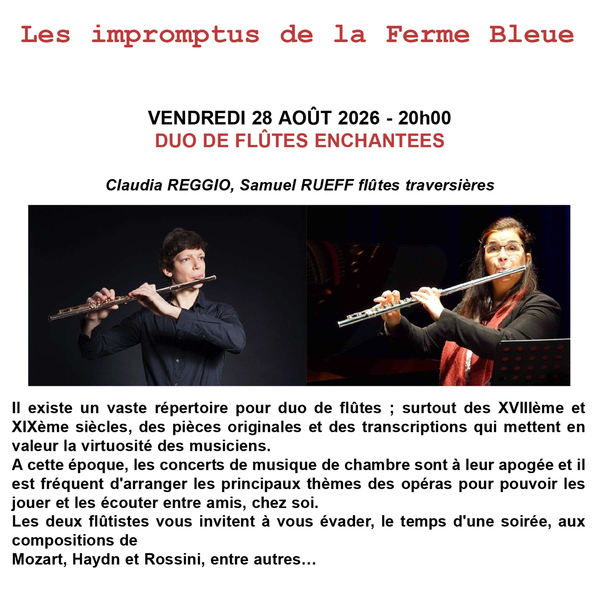 Les deux flûtistes vous invitent à vous évader, le temps d'une soirée, aux compositions de
